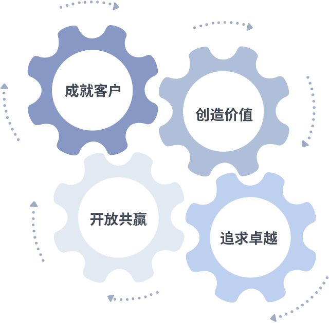 成就客户是一切决策的出发点,,,创造价值是衡量所有工作的标准,,,,追求卓越是我们做事做人的态度,,,开放共赢是我们的格局也是最终的结果。。。价值观的齿轮环环相扣,,,推动着组织里的每个人不断向前。。